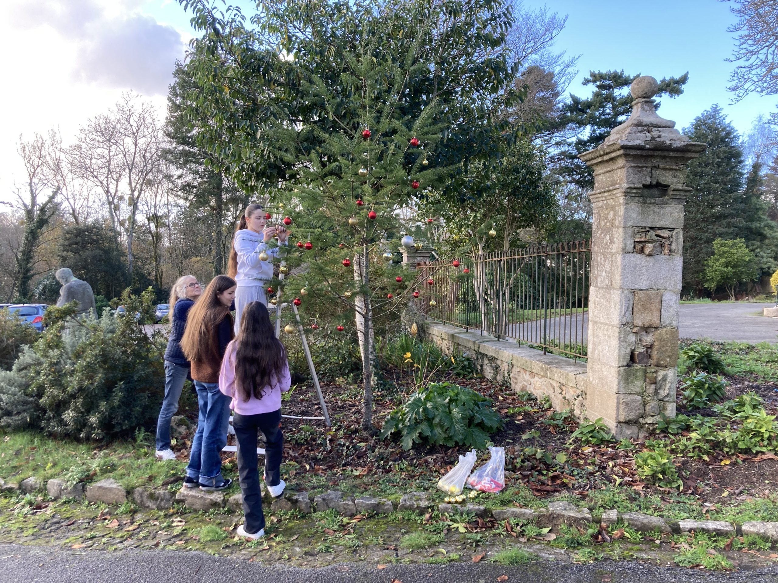 Ce mercredi, les élèves internes ont profité de leur pause pour donner un air de fête au parc du lycée🌲. Armés de quelques guirlandes 🎀 et de décorations colorées, ils ont habillé plusieurs arbres aux couleurs de Noël 🎅, sous la supervision de Mme Le Fur.