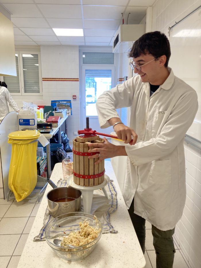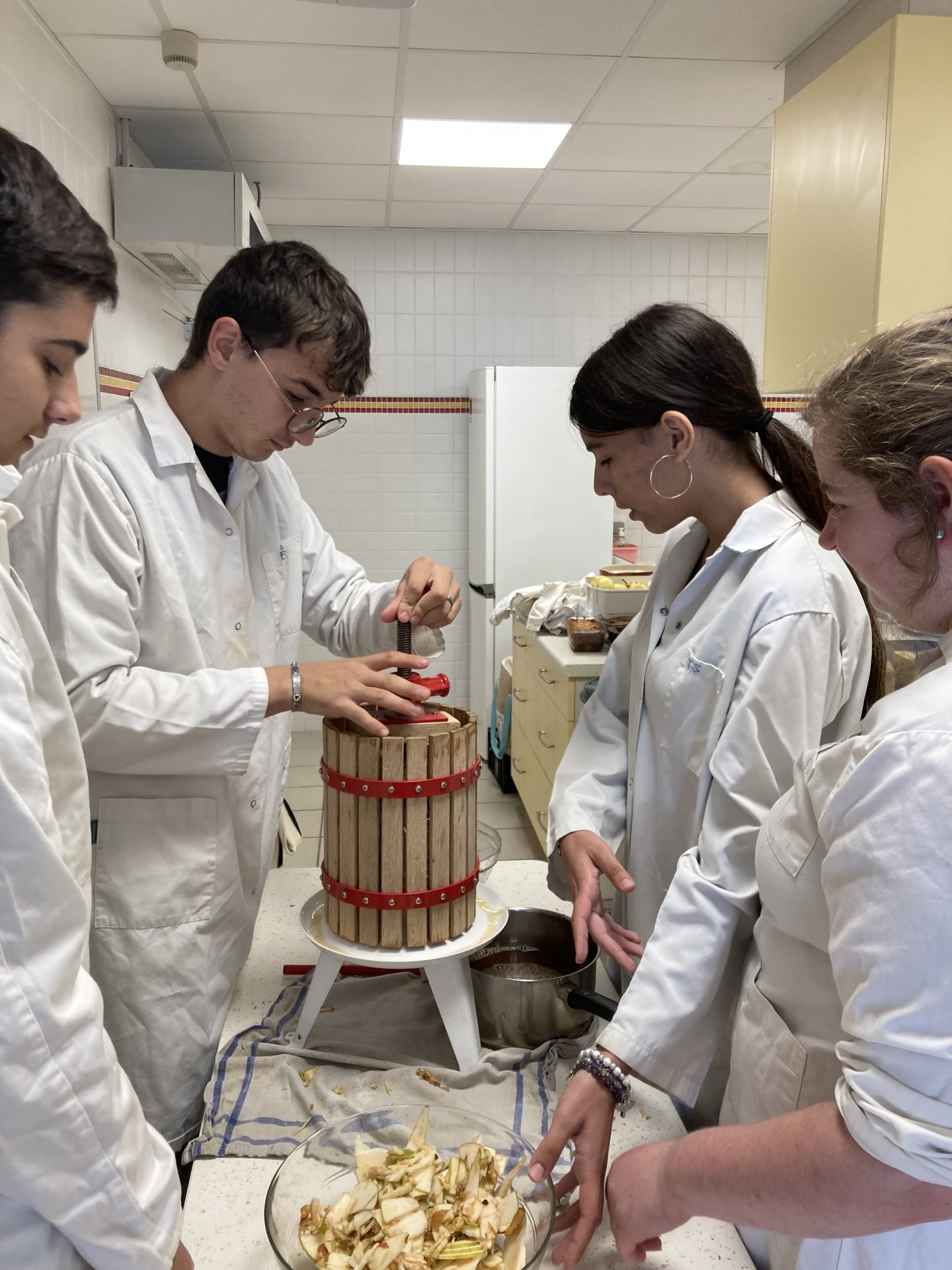 Les élèves de 1ère Vente ont pris part à une séance pratique de fabrication de jus de pomme 🍎, inspirée de leur visite à la Cidrerie Coïc. Guidés par les explications reçues sur place, ils ont utilisé un pressoir miniature pour extraire le jus, qu’ils ont ensuite pasteurisé avant de le mettre en bouteille.