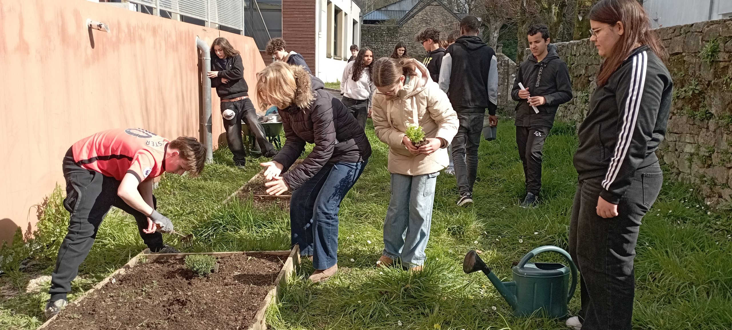 Le potager prend forme peu Ă  peu 🌱. Après la remise en Ă©tat, place aux plantations ! Les 3e se sont activĂ©s avec enthousiasme : certains ont creusĂ© un trou pour le pĂŞcher tandis que d’autres se chargĂ©s de planter des salades , des framboisiers et des herbes aromatiques. Ce projet permet ainsi de transformer un bout de terrain inoccupĂ© en un espace de vie et d’apprentissage.