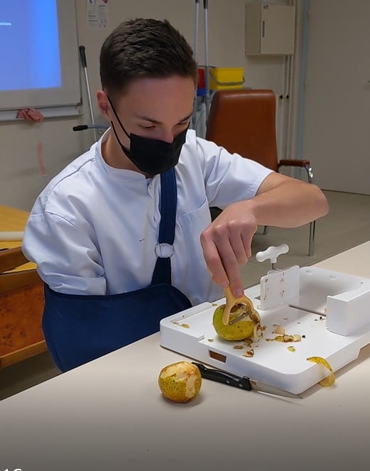Grace à l’intervention de Manon, ergothérapeute, Nathan, Chloé, Cécilia et leurs camarades se sont glissés dans la peau de personnes souffrant de handicap temporaire ou durable. Eplucher une pomme, enfiler des bas ou des chaussettes, tenir ses couverts pour se nourrir, boutonner sa chemise, se relever de son lit…