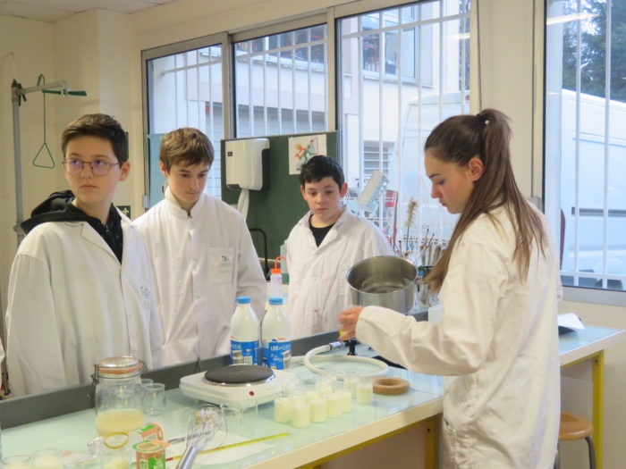 Les élèves de 2nde Laboratoire Contrôle Qualité ont fabriqué des yaourts ainsi que du kéfir de fruits. Ils ont pu mesurer le pH en cours d’acidification pour le yaourt, observer le dégagement gazeux pour le kéfir (expérience avec le ballon + figues qui remontent en surface) et réaliser une analyse sensorielle.